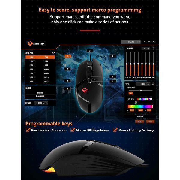 ماوس مخصوص بازی مدل Meetion MT-G3325محصولی حرفهای از برند « میشن » (Meetion) است که برای کاربران علاقهمند به بازی طراحی و تولید شده است. در واقع این ماوس مشخصاتی دارد که آن را برای بازی کردن ایده ال میکند. از فاکتورهای خریدهای بسیار مهم هنگام تهیه ماوسهای گیمینگ میزان دقت و قابلیت کنترل دقت در آنها است.اگر شما به صورت حرفهای بازی میکنید یا قصد دارید یک گیمر حرفهای باشید باید از لوازم مخصوص بازی استفاده کنید. ماوس و کیبورد مهمترین ابزار یک گیمر محسوب میشود. ماوس و کیبورهای بازی علاوه بر ظاهر در عملکرد و کیفیت هم با ماوس و کیبورد ساده تفاوتهای زیادی دارند. شما میتوانید از ماوس بازی برای کاربریهای روزمره استفاده کنید اما استفاده از ماوس عادی برای بازی کار عاقلانهای نیست. یکی از برندهایی که در زمینه تولید ماوس برای بازی فعالیت دارد، میشن است. ماوس مخصوص بازی مدل Meetion MT-G3325 یکی از محصولات این برند معتبر است.اولین نکته و تفاوتی که ماوس بازی با ماوس ساده داشته ظاهر آن است. این مدل هم ظاهری متفاوت با ماوسهای ساده دارد. برای طراحی این ماوس از طراحی مدرن و خطهای شکسته نامتقارن استفاده شده است. میشن تلاش کرده تا علاوه بر ظاهر جذاب، استفاده از ماوس هم برای گیمر آسان باشد. همین باعث شده تا نحوه قرارگیری کلیدها و شکل کلی ماوس برای یک گیمر استاندارد است. شاید در نگاه اول تصور کنید استفاده از این طرحها برای زیبایی بیشتر باشد اما اینطور نیست. گیمرها ساعتها مشغول بازی کردن هستند و استرس و هیجان زیاد باعث عرق کردن دست میشود. هنگامی که دست عرق کند استفاده از ماوس سخت شده و میتواند تاثیر بسیاری روی بازی داشته باشد. یکی دیگر از مهمترین ویژگیهای این مدل نور پردازی LED آن می باشد که به زیبایی دستگاه می افزاید.همچنین سطح موس از متریال مرغوب درست شده است که باعث می شود موس کیفیت ساخت بالایی داشته باشد و گرید موس را افزایش می دهد. هریک از دکمه ها توانایی تحمل 30 میلیون بار فشار را دارند. دکمه های این موس قابل برنامه ریزی می باشند که این ویژگی برای بازی بسیار مناسب می باشد.به لطف چیپست مخصوص این موس (Pro Game Chip) دکمه ها جوابگویی خیلی سریعی دارند.