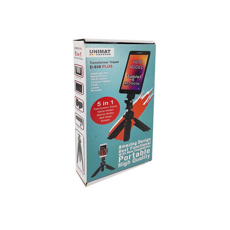 پایه نگهدارنده یونیمات D-930 Transformer محصولی جدید از برند Unimat با امکانات بیشتر و ویژه نسبت به مدل های پیشین خود است . این مدل دارای یک عدد هد با قابلیت تغییر زاویه است که علاوه بر دکمه تنظیم سه پایه، میتوانید به صورت جداگانه به تجهیزات متصل بر روی هد همچون موبایل، دوربینهای کامپکت، پنل های ال ای دی، میکروفون و … نیز زاویه افقی و عمودی بدهید.