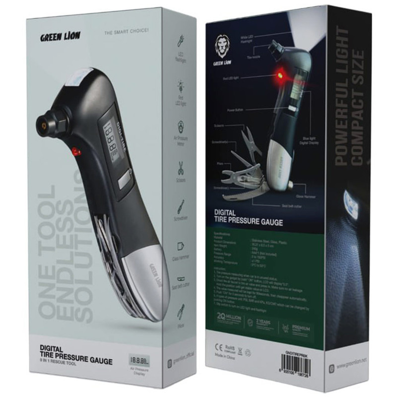 ابزار نجات 9 در 1 گیج لاستیک دیجیتال Green Lion در رنگ مشکی با کد فنی GNDITIREPRBK یک همراه ضروری برای هر راننده است. این ابزار چند منظوره برای اطمینان از ایمنی و راحتی شما در جاده طراحی شده است. دارای فشارسنج دقیق هوا می باشد و محدوده 2 تا 150 PSI و دقت 1± PSI است این امر نگهداری لاستیک را آسان و چراغ قوه LED در نور کم کمک می کند. این ابزار همچنین دارای چکش شیشه ای، پیچ گوشتی، قیچی، برش کمربند ایمنی و انبردست است. در مواقع اضطراری مفید هستند. این ابزار با عملکرد موثر در محدوده دمایی 0 تا 50 درجه سانتی گراد، برای مقاومت در برابر محیط های مختلف ساخته شده است. این دستگاه با یک باتری قلمی کار میکند (که همراه این محصول نمی باشد)، و اطمینان میدهد که میتوانید به راحتی آن را روشن نگه دارید، ابزار نجات 9 در 1 گیج فشار تایر دیجیتال Green Lion هم فشرده و هم بادوام است. این به طور هوشمندانه عملی و ایمنی را در یک طراحی واحد و نوآورانه ترکیب می کند.