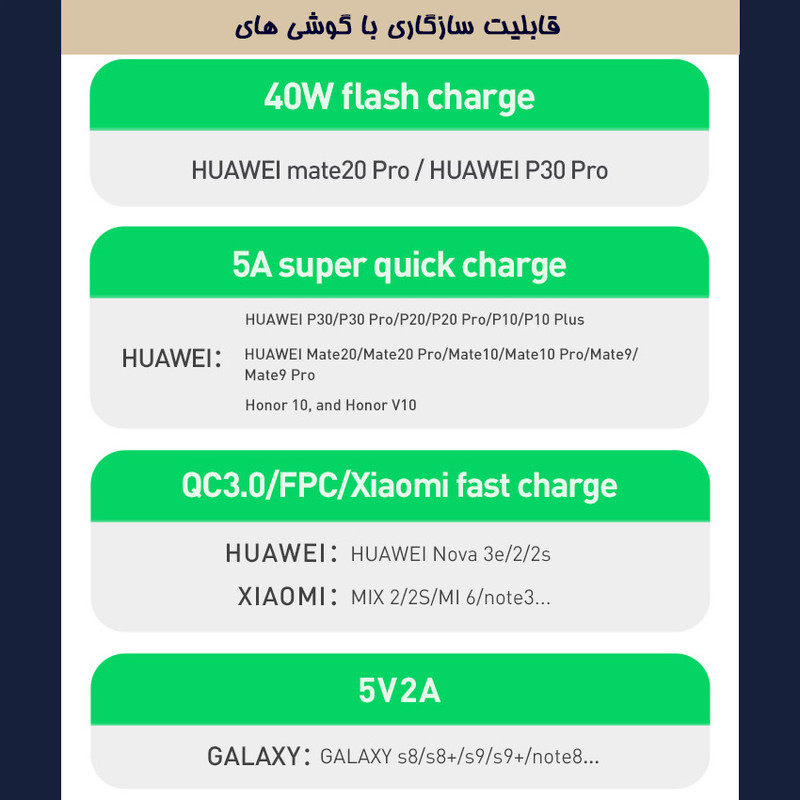 سایر توضیحات کابل: 40 وات 5 آمپر فست شارژ جهت گوشی های هوآوی