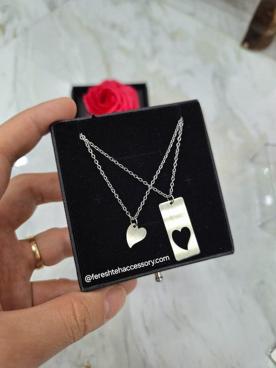 🍃ست گردنبند زوجی مدل قلب و پلاک، ساخته شده از استیل باکیفیت و رنگ ثابت. طراحی خلاقانه این ست شامل یک پلاک با برش قلب و یک گردنبند قلبی جداگانه است که نمادی از پیوند عمیق و عشق واقعی بین دو نفر میباشد. مناسب استفاده روزانه و هدیهای خاص برای مناسبتهایی همچون ولنتاین، سالگرد، تولد و روز عشق. مقاوم در برابر تغییر رنگ و ضد حساسیت.🍃
