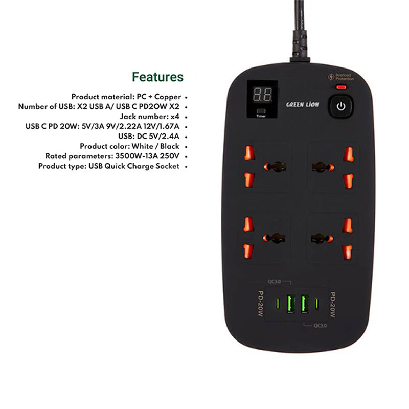 دارای دو پورت USB-A از نوع QC3.0 | دارای دو پورت Type-C از نوع PD | دارای نمایشگر دیجیتال | طول کابل متصل 3 متر | پریزهای برق از نوع Universal و مناسب برای استفاده در هر مکان