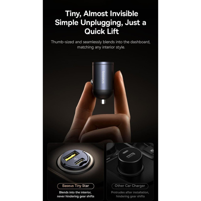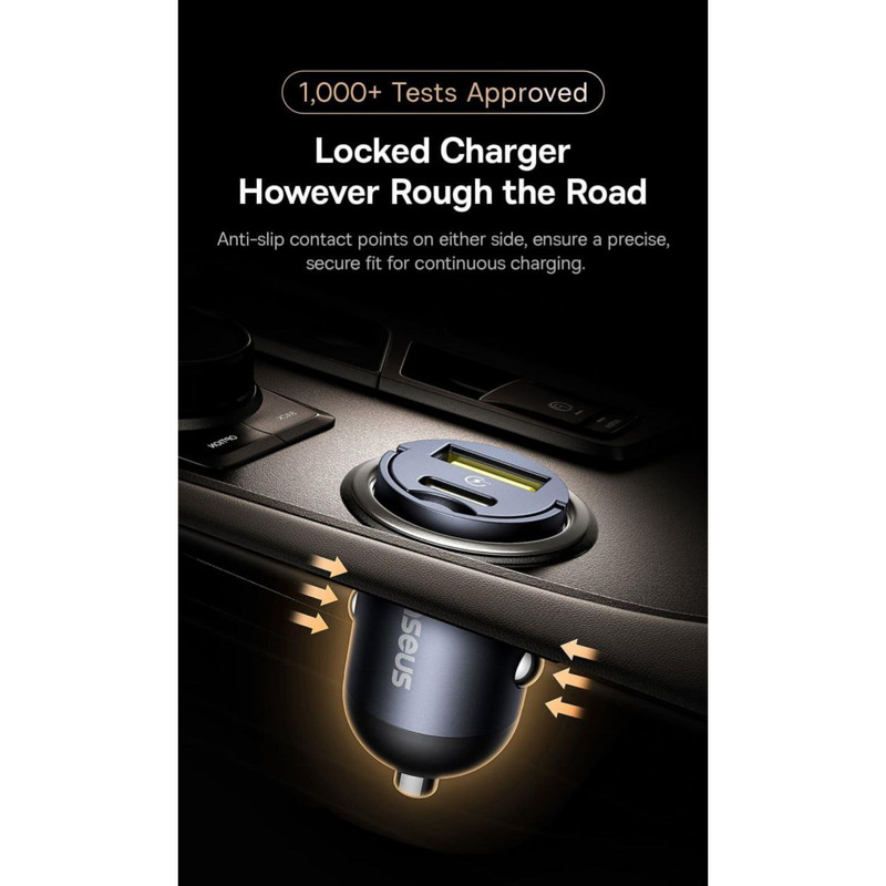 یکی از ویژگیهای برجسته شارژر فندکی بیسوس، طراحی بسیار کوچک و جمعوجور آن است. این شارژر به قدری کوچک است که میتواند به راحتی در هر فندکی ماشین قرار بگیرد بدون اینکه فضای زیادی را اشغال کند. این ویژگی به شما این امکان را میدهد که شارژر را به راحتی در فندکی ماشین خود قرار دهید و از آن برای شارژ دستگاهها استفاده کنید.