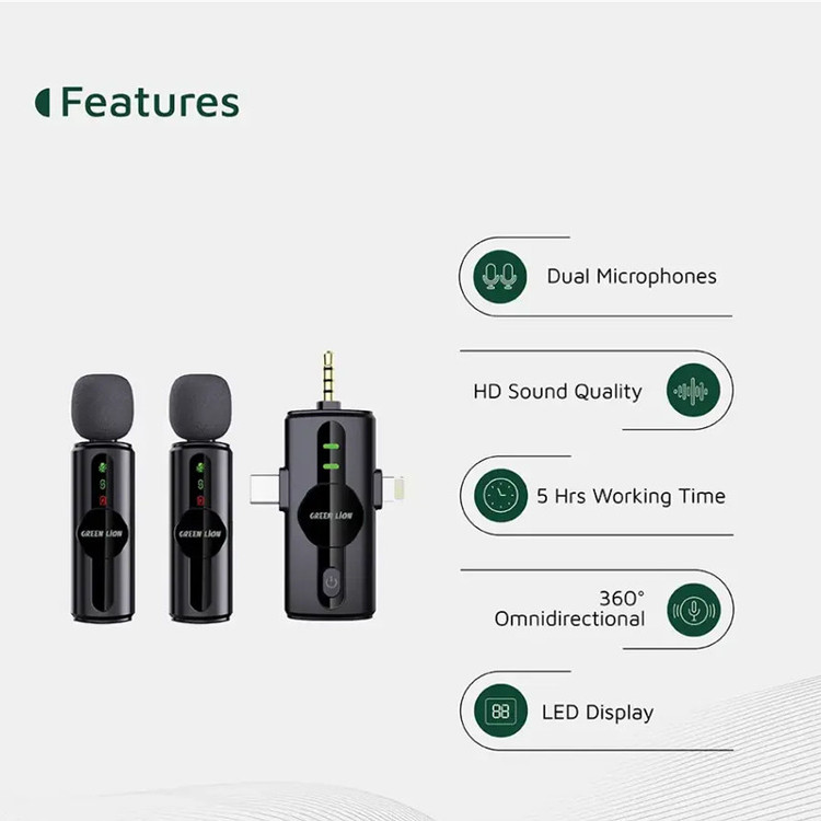 کانکتور LIGHTNING | کانکتور جک ۳٫۵ میلیمتری | کانکتور Type-C | کیفیت صدای HD | حساسیت 38DB- | بازه عملکرد حدود 20 متر | ابعاد میکروفون : حدود 66*21*17 میلی متر | ابعاد گیرنده : حدود 12.6*42.2*73.3 میلی متر | ابعاد کیف نگهدارنده : حدود 120*90*40 میلی متر