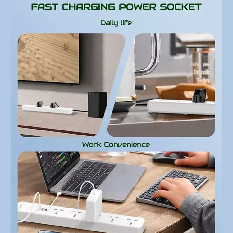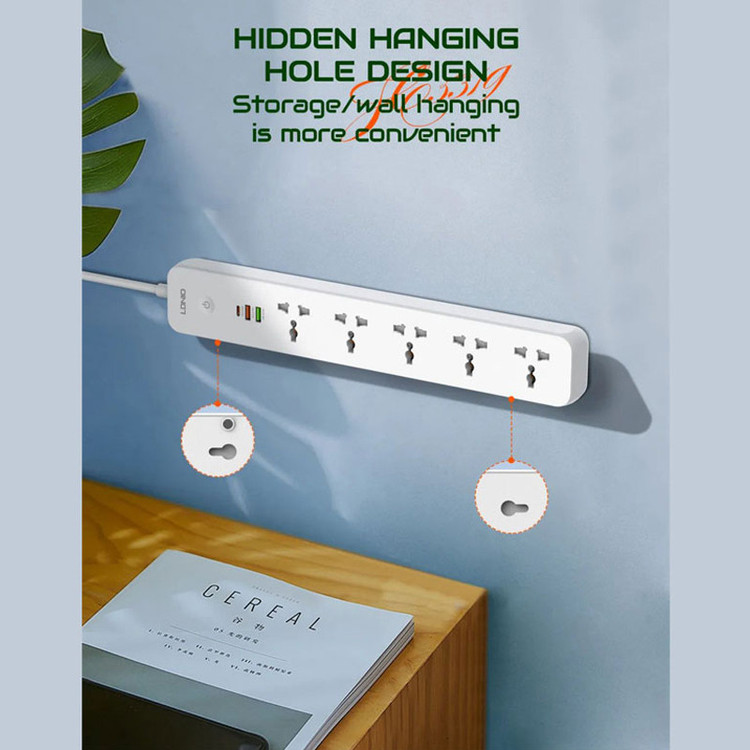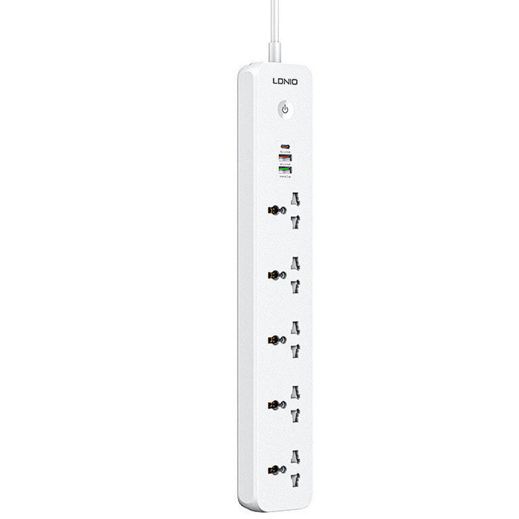دارای 5 پریز و 3 پورت usb | دارای پورت تایپ سی PD و یو اس بی QC3.0 | دارای دکمه خاموش / روشن لمسی