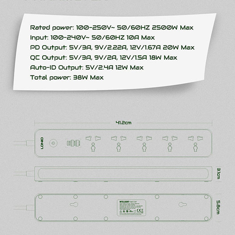 توضیحات پریز: 5 پریز از نوع Universal | سازگار با انواع پریزهای EU و US و UK