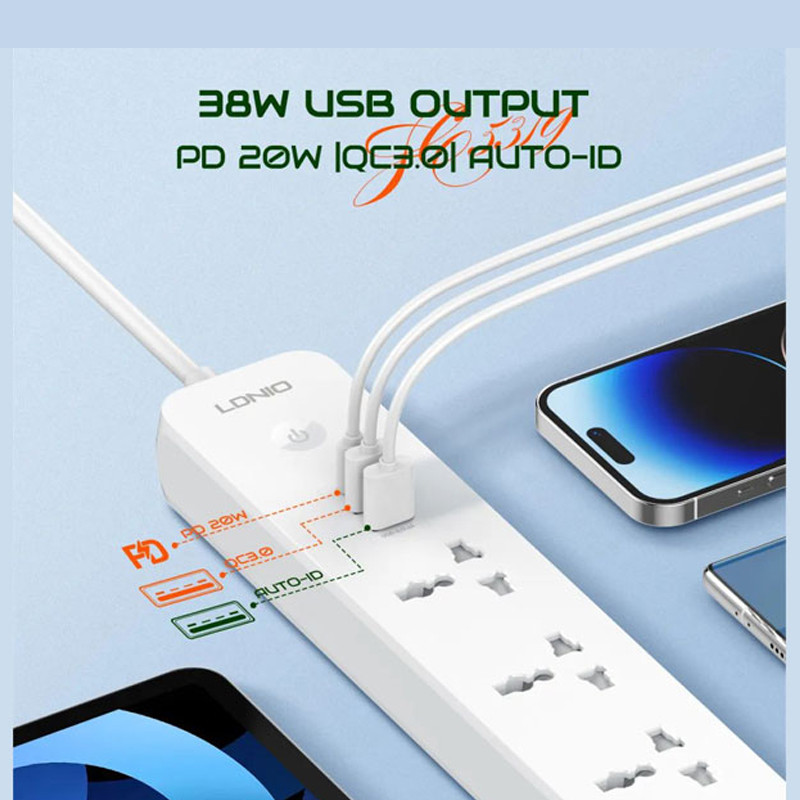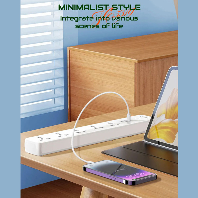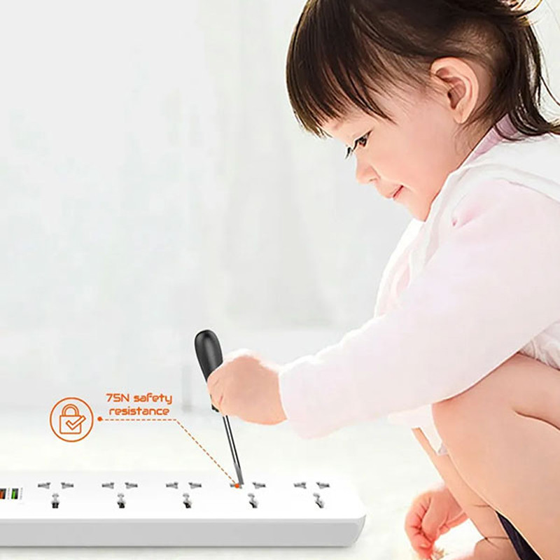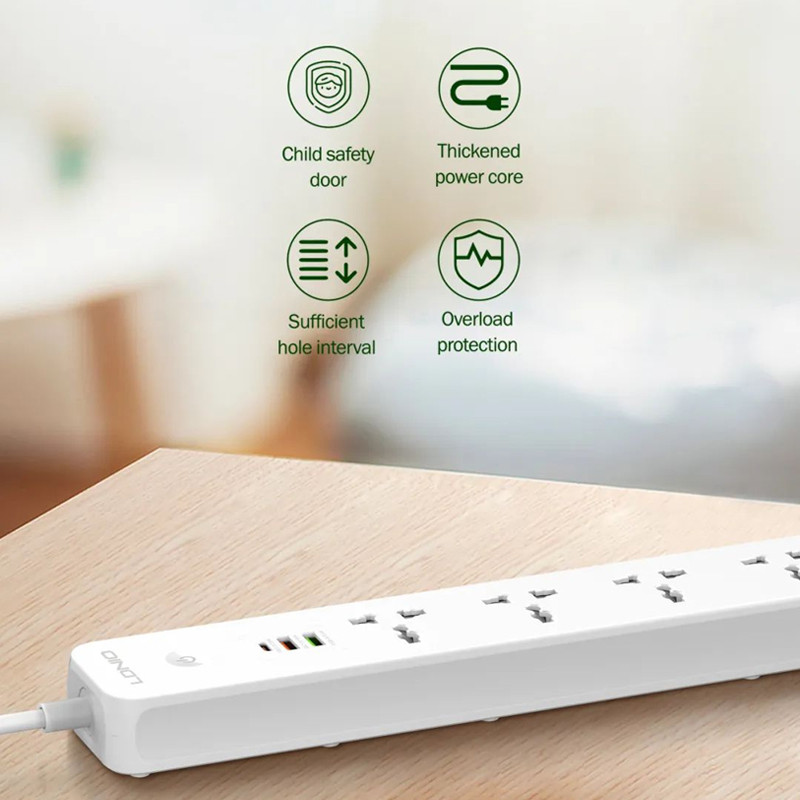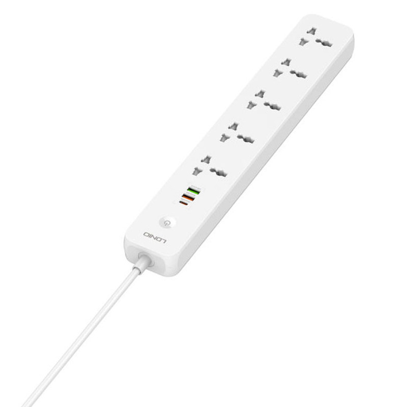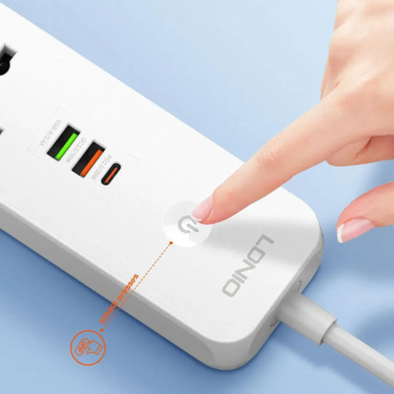 دارای 5 پریز و 3 پورت usb | دارای پورت تایپ سی PD و یو اس بی QC3.0 | دارای دکمه خاموش / روشن لمسی