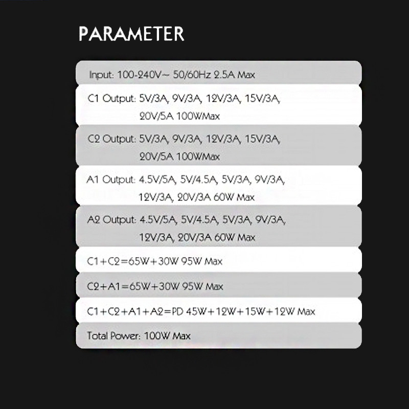 در این شارژر، خروجی C1 و C2 از نوع تایپ سی است و هر کدام دارای جریان/ولتاژ خروجی 5V/3A-9V/3A-12V/3A-15V/3A-20V/5A و حداکثر توان 100 وات است.