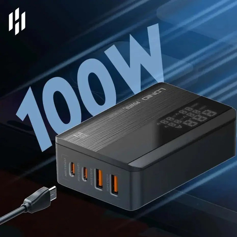 شارژر LDNIO A4809C با حداکثر توان خروجی 100 وات و داشتن 4 پورت خروجی متشکل از 2 عدد USB و 2 عدد Type C می تواند انتخاب خوبی برای میز کارتان باشد. این شارژر رومیزی با فناوری ساخت گالیم نیترات GaN طراحی شده است و از مواد PC نسوز تا 850 درجه سانتیگراد ساخته شده است و به عنوان هاب شارژر مورد استفاده قرار می گیرد. روی بدنه آن یک صفحه نمایش دیجیتالی قرار گرفته تا میزان ولتاژ و شدت جریان شارژ را به شما نمایش دهد.
